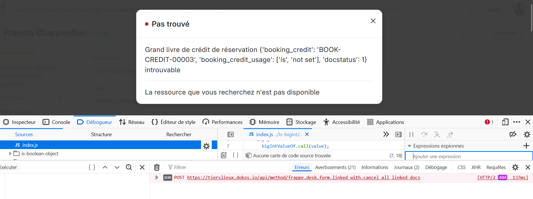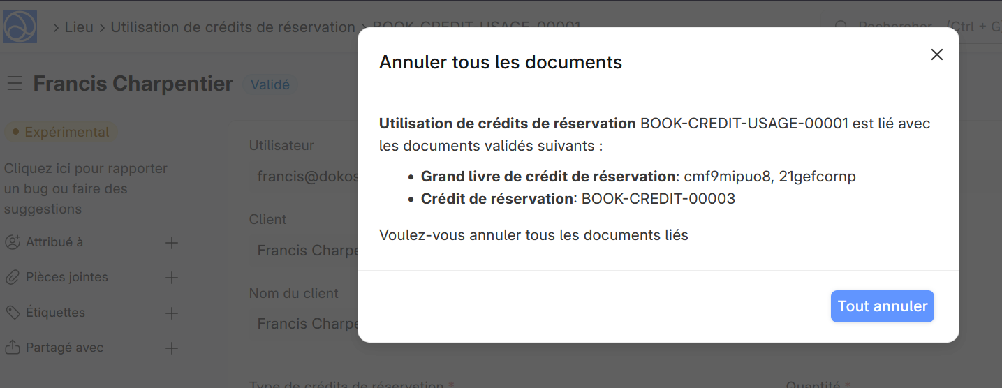 J’ai voulu annuler manuellement des crédits utilisés lors d’une réservation depuis le desk mais j’obtiens une erreur. J’ai alors fait le test sur la démo dokos et j’obtiens la même erreur. Quand j’essaie d’annuler l’utilisation de crédit et que je clique sur Tout annuler