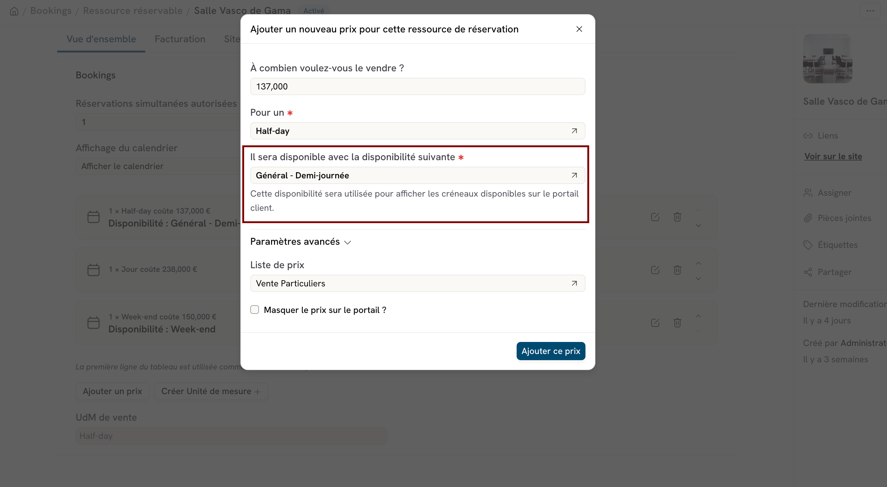 Disponibilitépeut être assignée à une unité de mesure et un prix au niveau de chaque ressource. Concrètement cela signifie que l’on pourrait avoir un préavis spécifique à chaque ressource et prix.