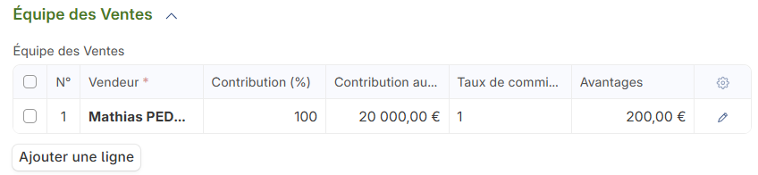 J’ai essayé d’utiliser le système “équipe de vente” qui permet de créer un vendeur et de lui attribuer un “Taux de commission”.