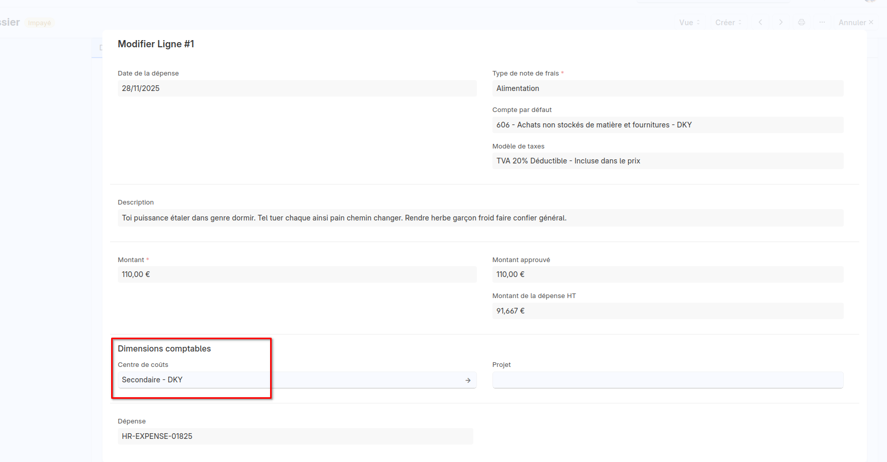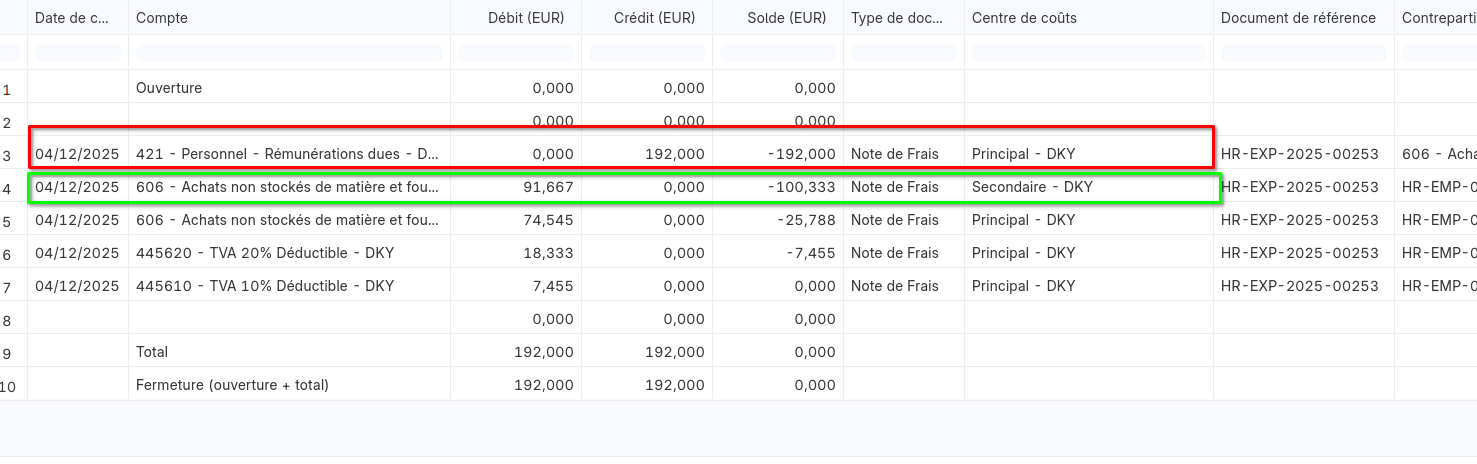 J’ai enregistré une note de frais et j’ai effectué un export des écritures comptables pour vérifier le traitement réalisé par le logiciel.
