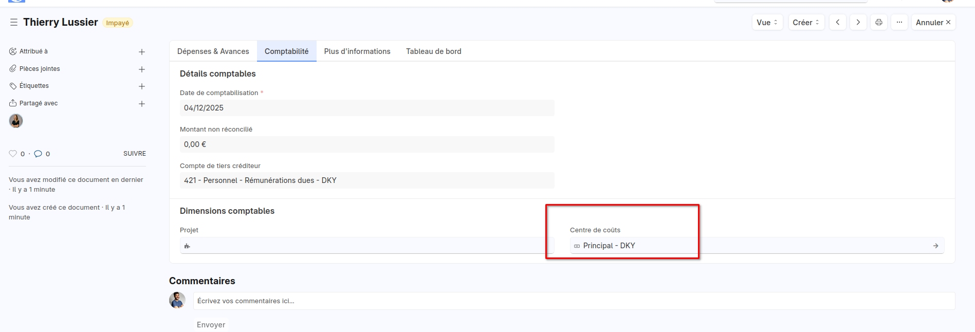 Compte de tiers - affectation = centre de coût CCTEST2