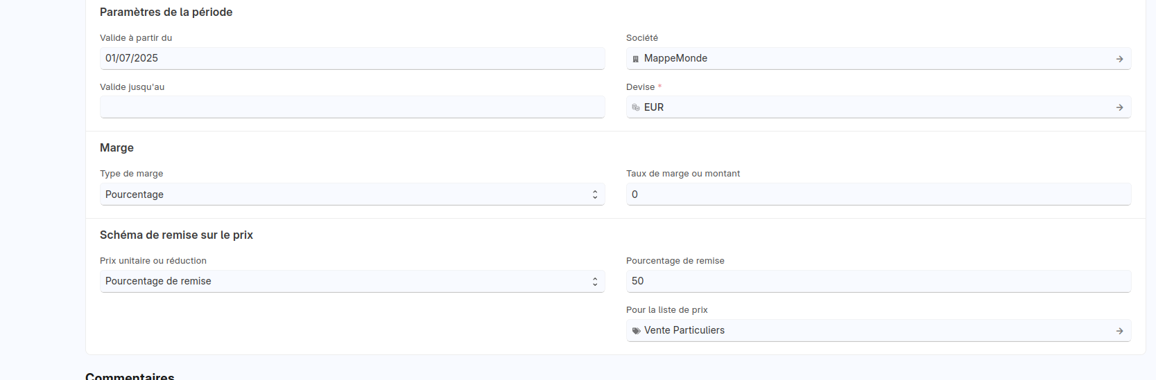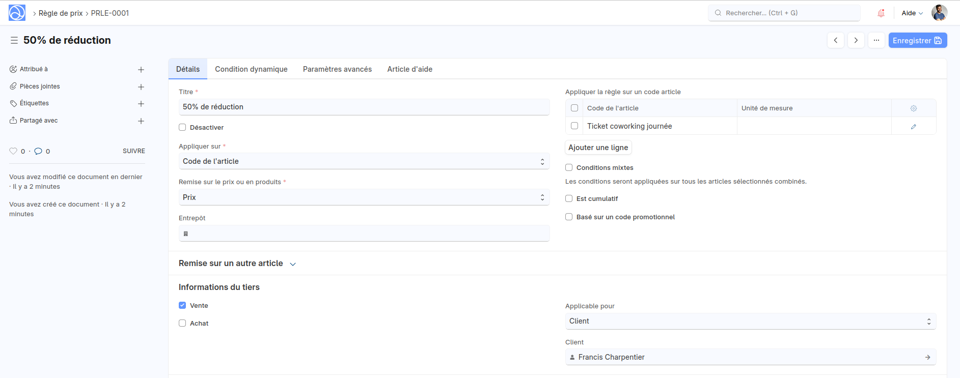 Pour Francis Charpentier (mais j’aurai pu appliquer cette réduction à un groupe de clients), je crée une règle de prix qui applique une remise de 50%: