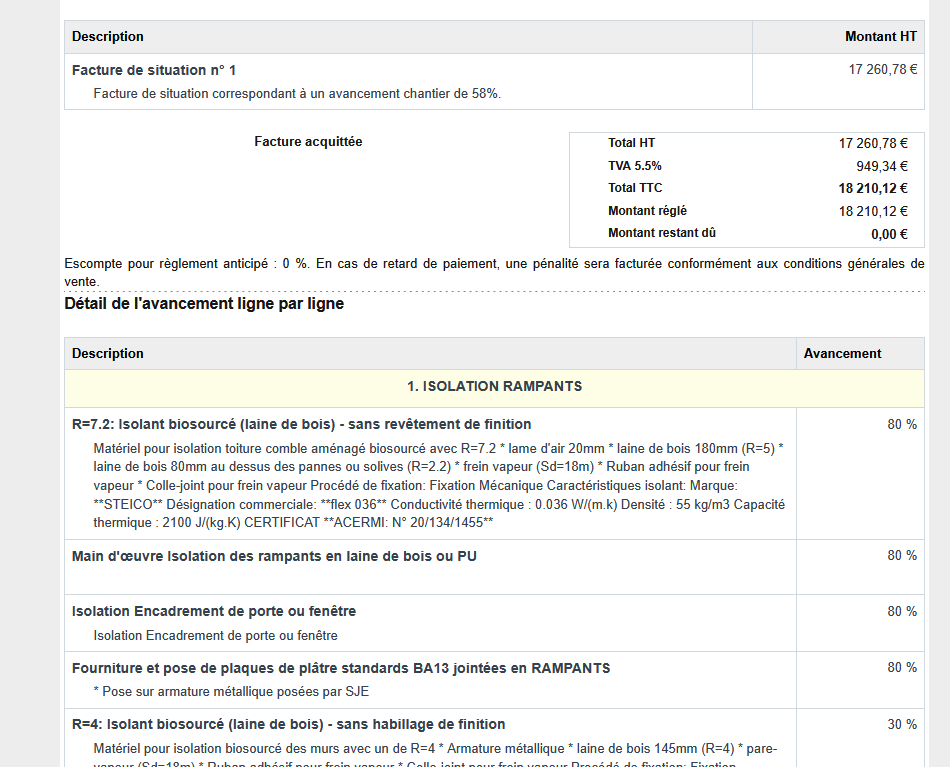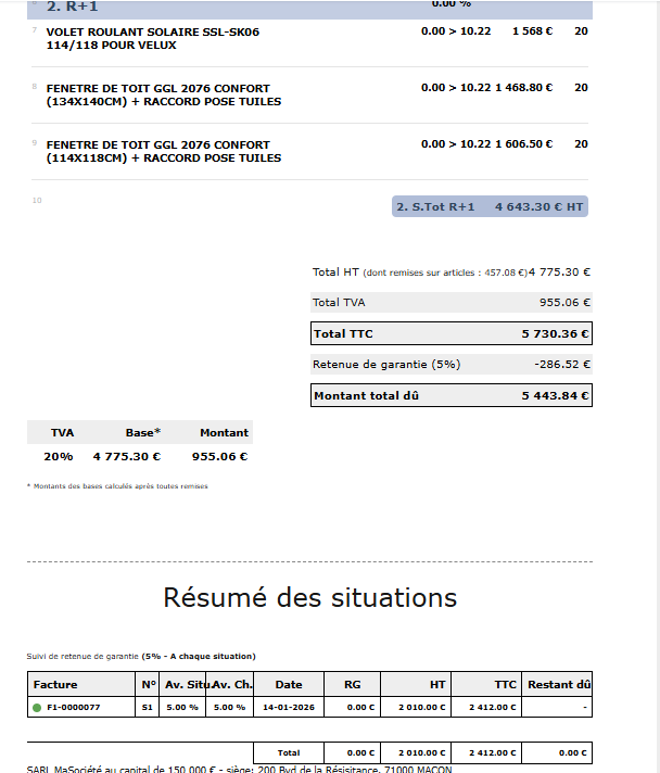 Le montant de la dernière facture (je n’ai pas coché facture de situation) est du coup de : 921.52 € TTC.
