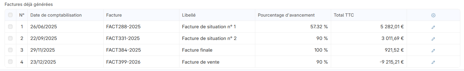 J’ai un chantier ou j’ai réalisé plusieurs facturation de situation (j’utilise l’application chantier), j’ai émis la dernière facture. J’ai bien le récapitulatif des facturations.