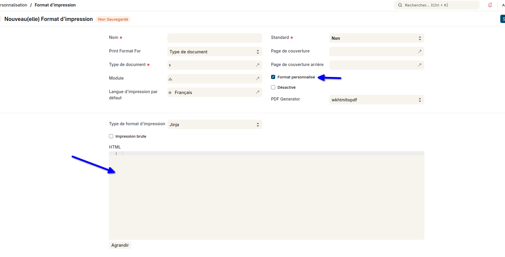 Tu peux développer un format d’impression entièrement sur mesure en utilisant l’option “Format personnalisé” dans les formats d’impression. Cela nécessite cependant des compétences en HTML/Jinja