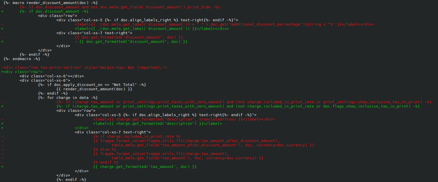 Voici la différence de code entre ERPNext (en vert) et Dokos (en rouge)