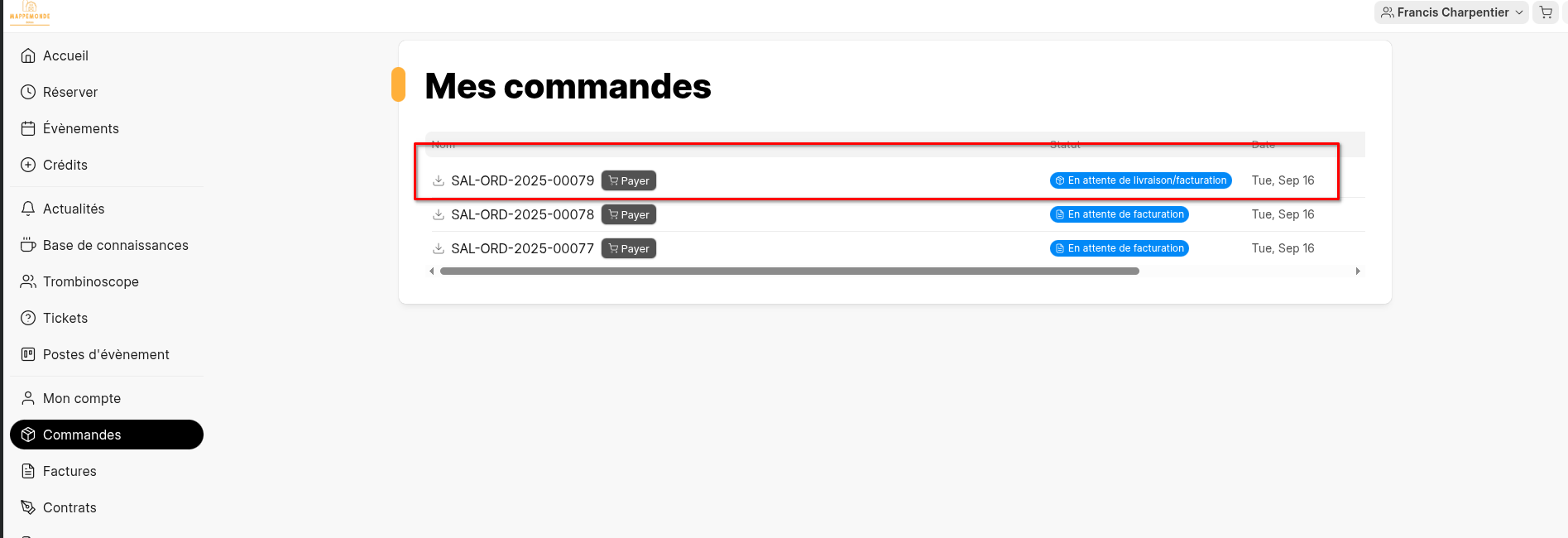 Exemple d’une commande créée et validée dans Dokos. Francis Charpentier la voit bien dans son espace client: