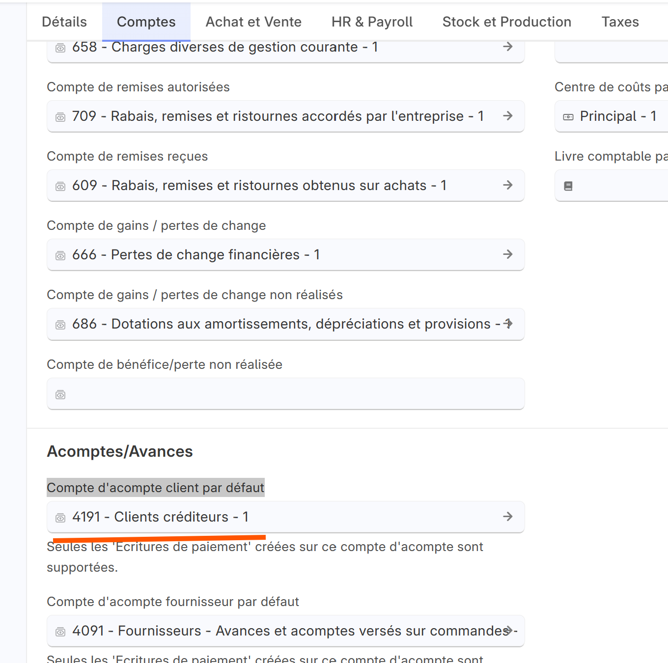 Est-ce que dans la fiche société / comptes, il y a bien le paramétrage de “Compte d’acompte client par défaut” dans la section Acomptes/avances?