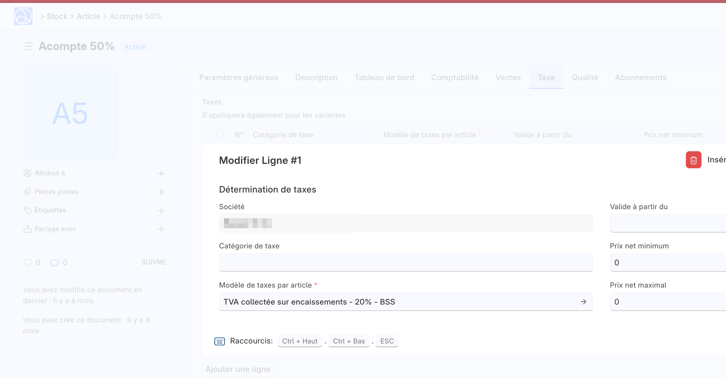 J’ai vérifié et le compte d’acompte client est bien défini. De plus j’ai bien désactivé tout les modèles de taxes et frais de vente sur le système et j’ai paramètré une TVA par article.