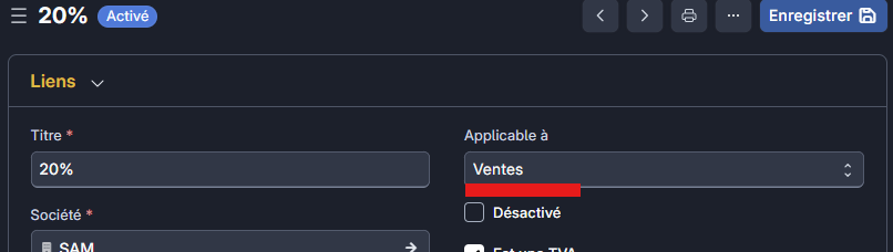 - Dans modèles de taxes par article, dans le champs “Applicable à ”, renseigner “Ventes” ou “Achats”. Cela permettra de distinguer la chaine des ventes et celle des achats et ne pas prendre une TVA Déductible si on est sur un devis client.