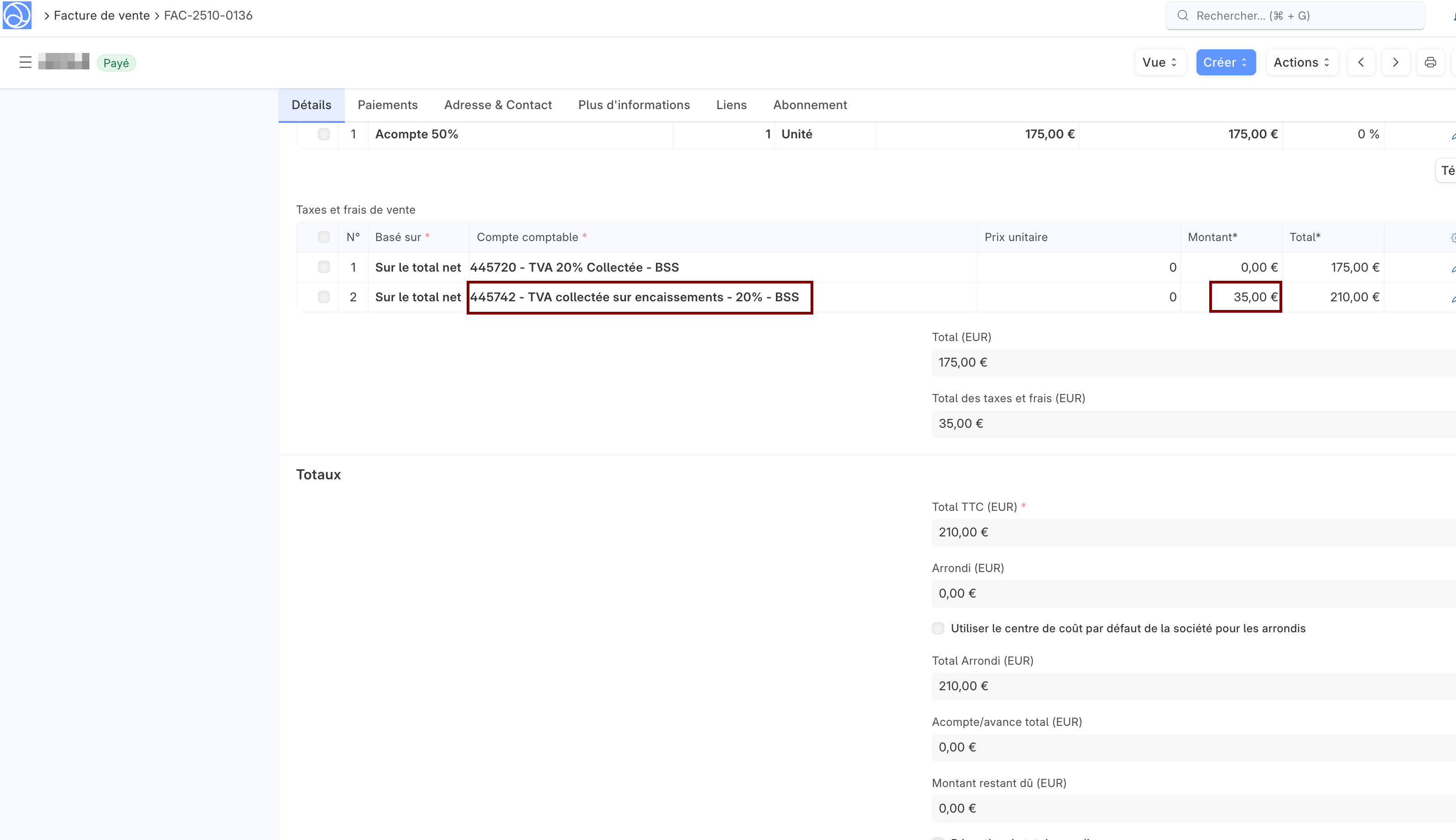 Le compte comptable utilisé sur l’acompte est bien 445742 TVA collectée sur les encaissements qui est bien celui que j’ai affecté à mon article d’acompte et configuré au niveau de la société comme compte d’attente.