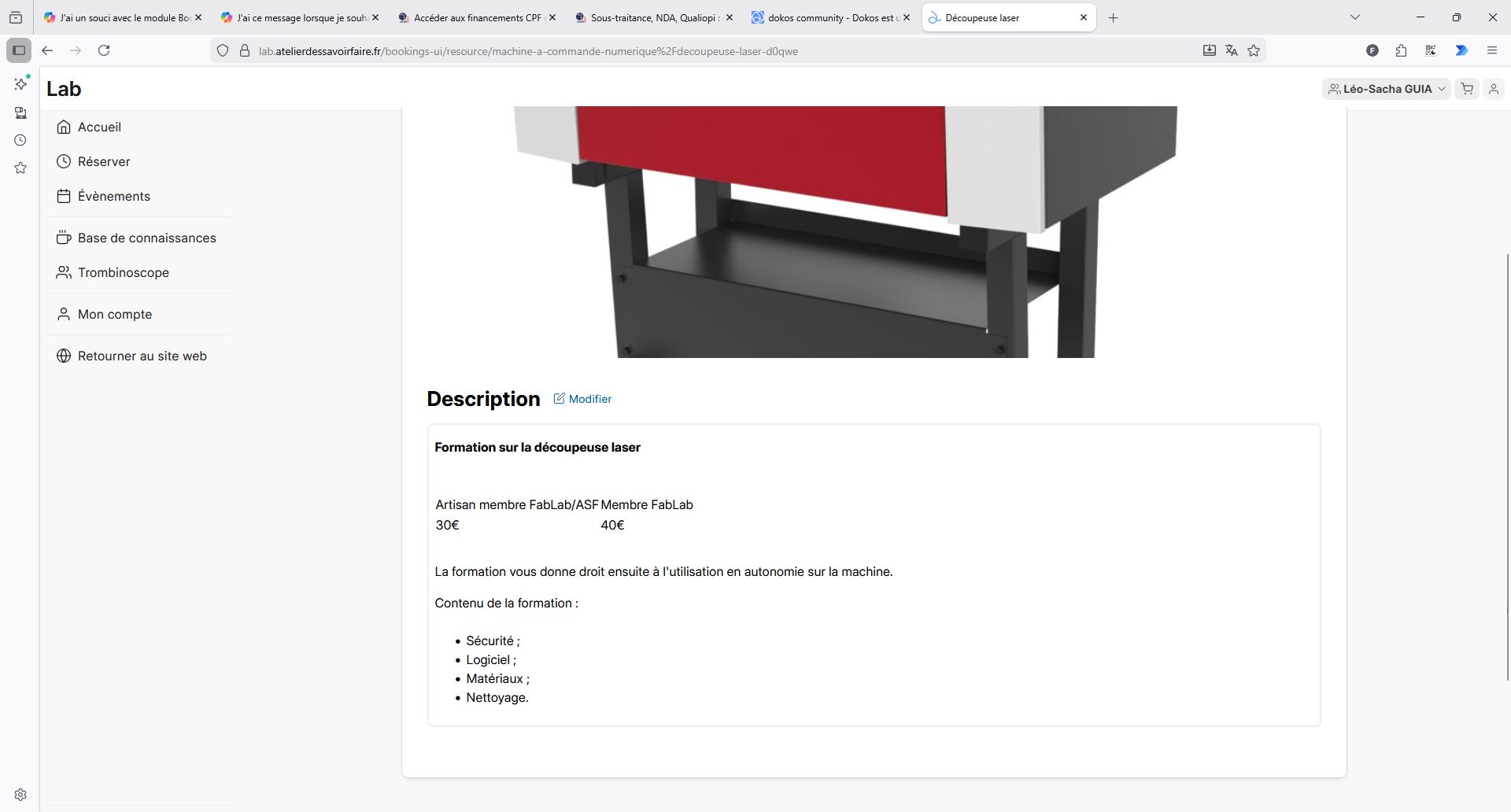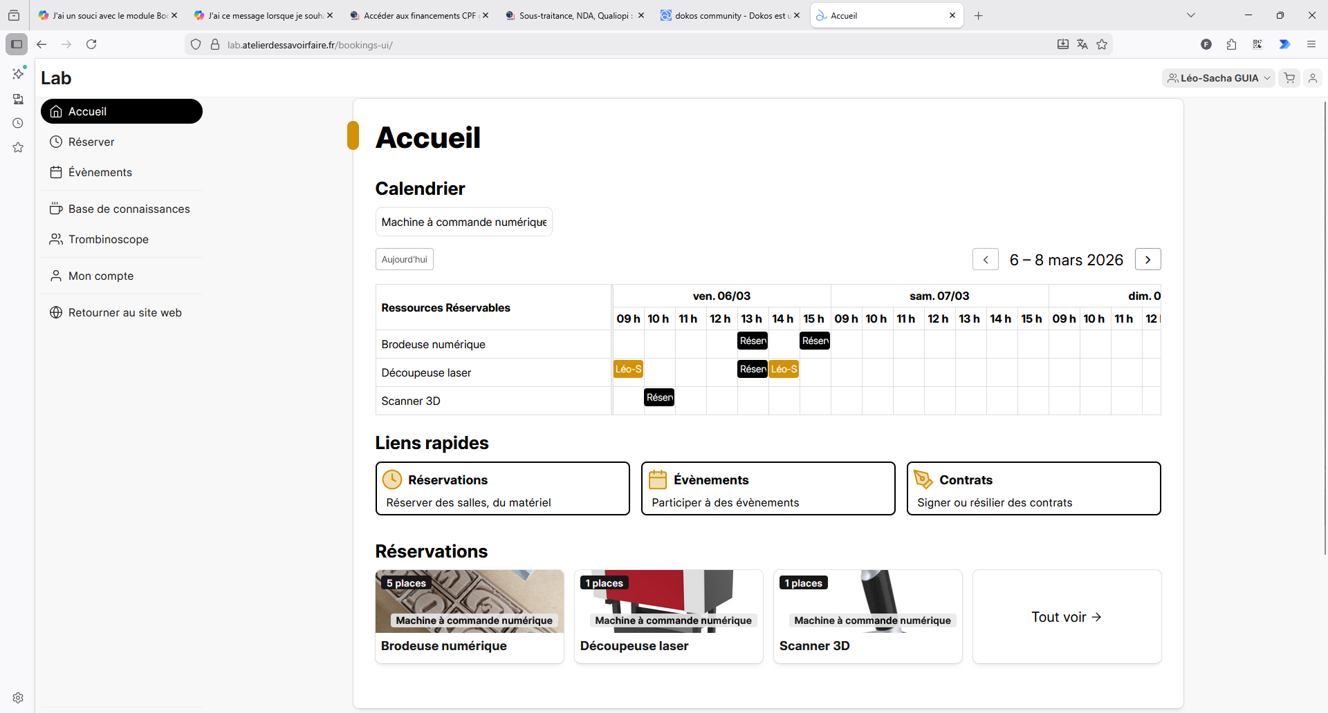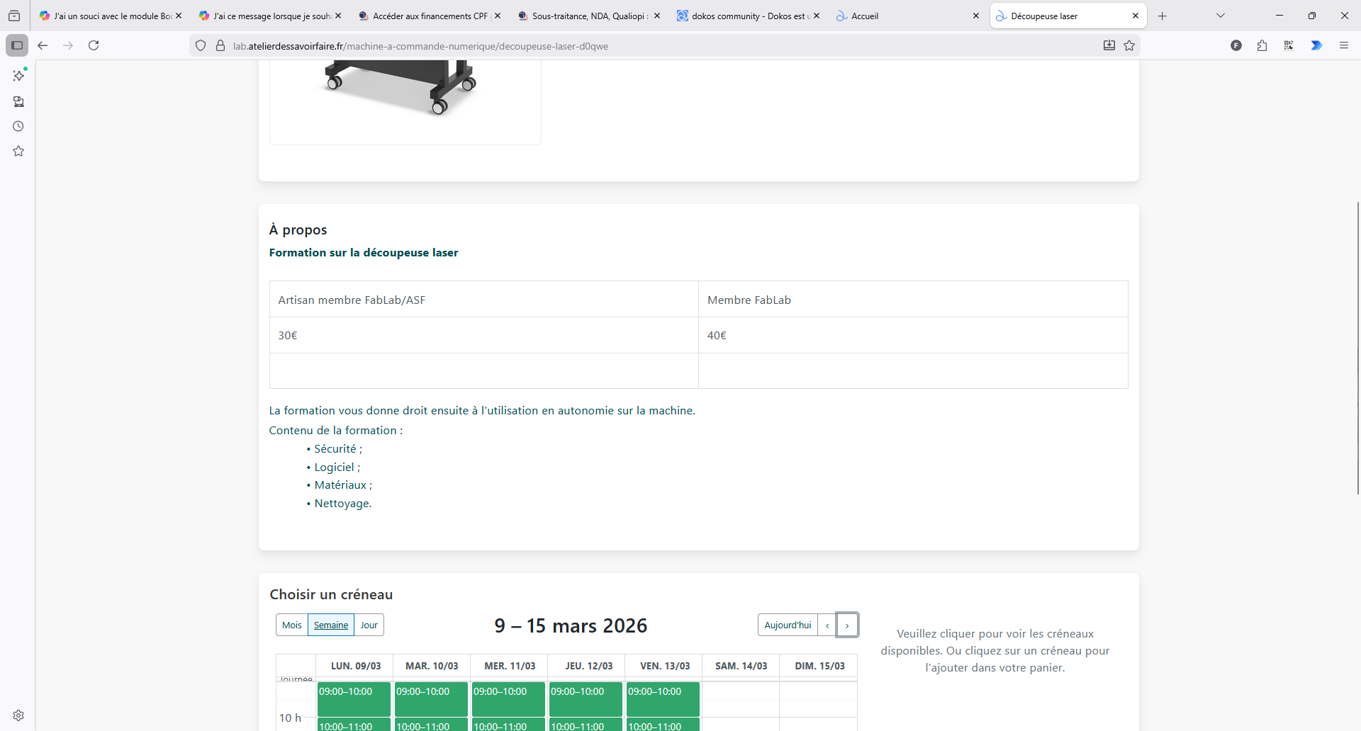 Je sais que Dokos V5 arrive sans tarder pour faire évoluer les fonctionnalités et l’interface. En tant que nouvel utilisateur (responsable d’un tiers-lieu avec des ateliers d’artisanat et un FabLab), j’arrive pile à temps pour découvrir la nouvelle version. Je désirais publier la page de réservation sur le sous-domaine suivant : lab.atelierdessavoirfaire.fr