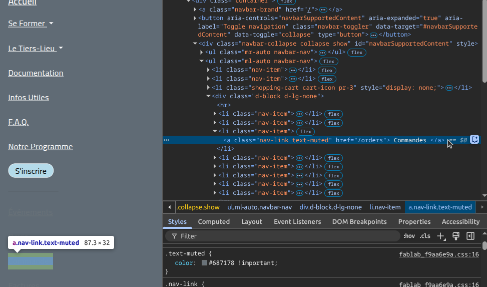 Trouvé @nathan_EcoCentre ! Les liens sont bien présents, mais ils sont gris à cause de l’interaction entre le fond gris du menu et la classe .text-muted.